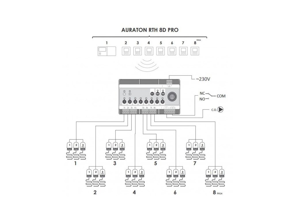 - 8 zón vytápění (8 kanálů pro bezdrátový přenos, 8x výstup 230V pro termoelektrický pohon)
