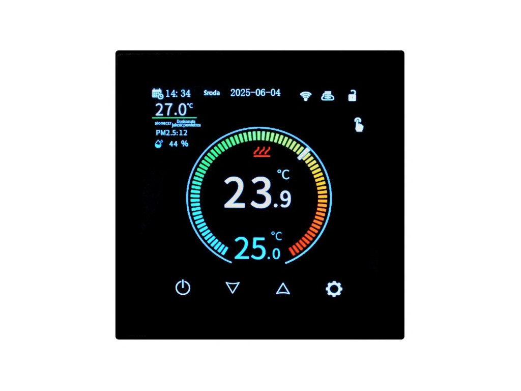 AURATON Octa je moderní, zapuštěný drátový termostat s barevným TFT IPS displejem s vysokým rozlišením, který se vyznačuje elegantním designem a pokročilými funkcemi. AURATON Octa nabízí týdenní programování, režim dovolené, rodičovský zámek a ochranu proti přehřátí. Může také pracovat v režimu vytápění nebo chlazení. Po připojení k síti Wi-Fi zobrazuje aktuální čas, datum, den v týdnu, venkovní teplotu a vlhkost, stejně jako povětrnostní podmínky, kvalitu ovzduší a hladinu prachu PM 2,5 – všechna data přizpůsobená umístění zařízení. Termostat je kompatibilní s mobilními aplikacemi Smart Life a Tuya, což umožňuje pohodlné ovládání vytápění z telefonu nebo tabletu. AURATON Octa je chytré řešení, které kombinuje moderní design, pohodlné ovládání a úplnou kontrolu nad teplotou v domácnosti.