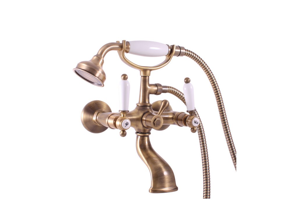 Vodovodní baterie vanová nástěnná s vidlicí na odkládání sprchy a sprchou.