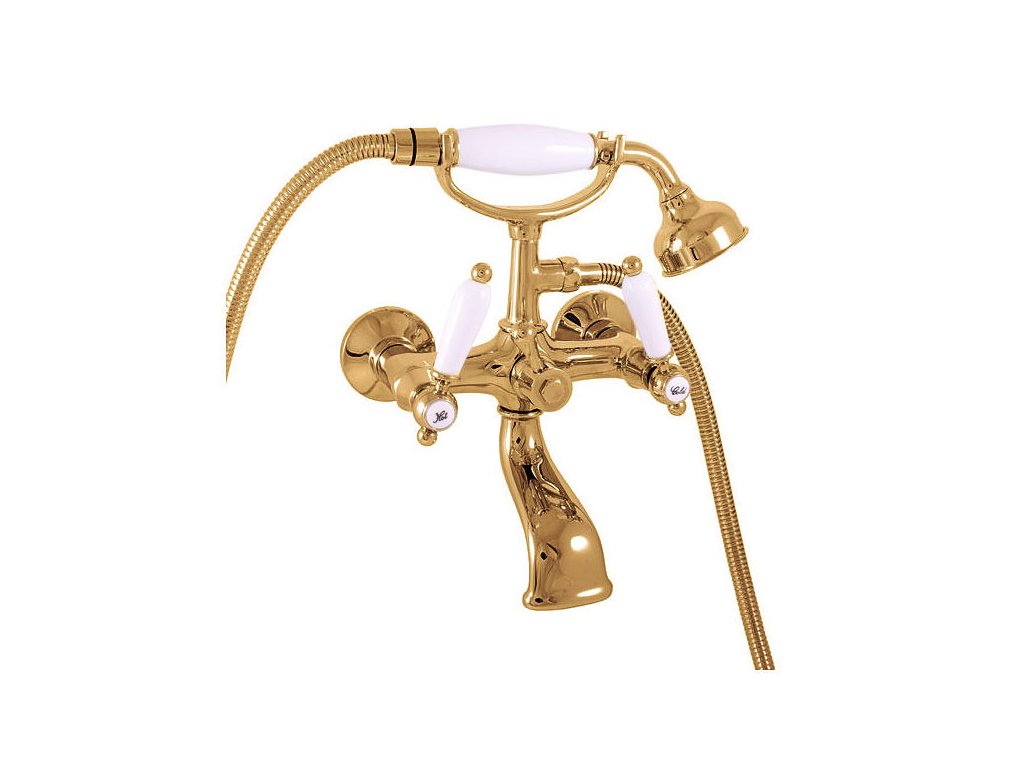 Vodovodní baterie vanová nástěnná s vidlicí na odkládání sprchy a se sprchou.
