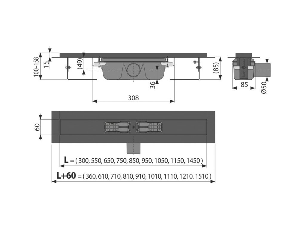 Celková stavební výška 100 158 mm | Minimální tloušťka betonu 85 mm | Odolnost zápachové uzávěry proti tlaku 982 Pa | Odpadní potrubí průměr 50 mm | Průtok 60 68,8 l/min | Třída zatížení K3 300 kg