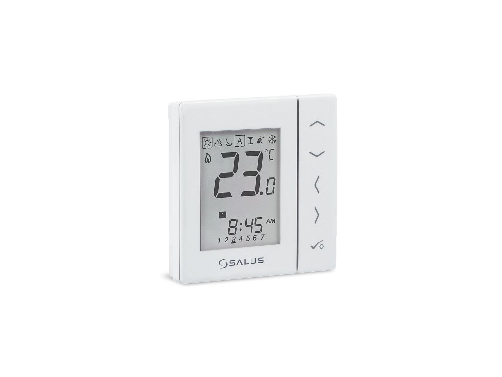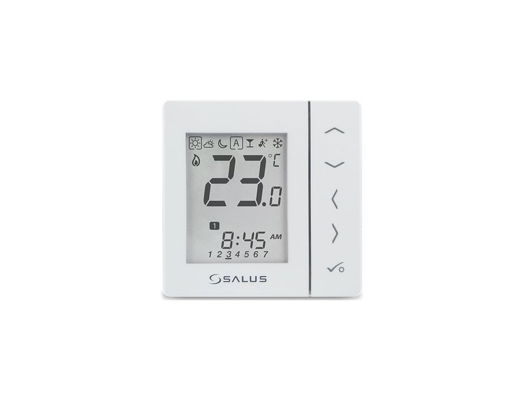 Podomítkový pokojový termostat SALUS VS30W je vhodný k regulaci podlahového vytápění / chlazení, vyznačuje se vysokou tepelnou setrvačností. Termostat je možné připojit k centrální svorkovnici, pomocí níž může ovládat denní termostaty – signál NSB je přepne na ekonomickou teplotu. Termostat umožňuje vytvářet vlastní harmonogramy teplotních změn, které jsou pak společné pro všechny termostaty (v závislosti na týdenním termostatu). Teploty se nastavují individuálně na každém termostatu.Základní vlastnosti: