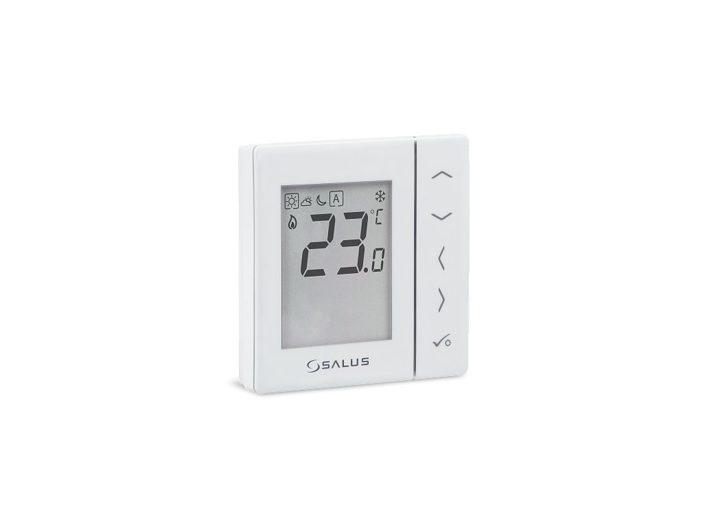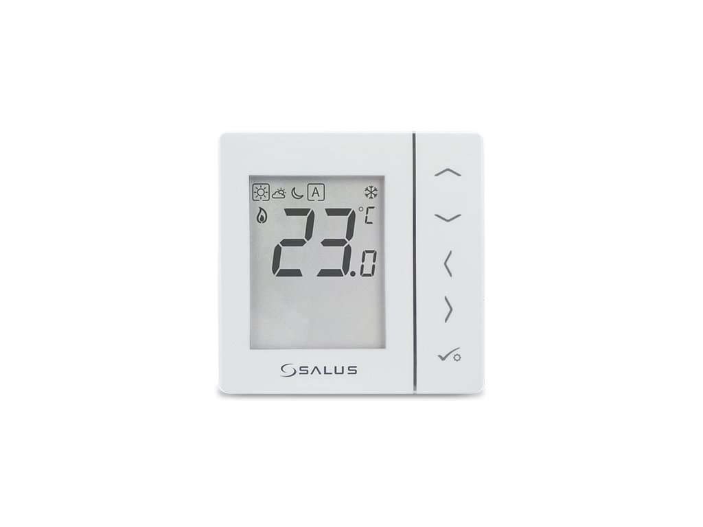 Podomítkový pokojový termostat SALUS VS35W je vhodný k regulaci podlahového vytápění / chlazení, vyznačuje se vysokou tepelnou setrvačností. Termostat lze připojit k centrální svorkovnici. Termostat nemá možnost vytvářet vlastní harmonogramy teplotních změn – změny teploty pouze dle příkazu z programovatelného termostatu prostřednictvím centrální svorkovnice.Základní vlastnosti: